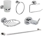 6 Piece Quality Bathroom Set includes a Towel hook, Toilet paper holder, Circle towel ring, Towel rail, Frosted Glass Tumbler, and Soap Dish with holders.