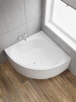 Compact acrylic tub with a modern curved design, ideal for corner installation. -