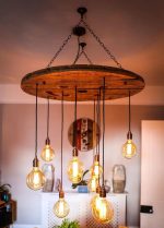 - A harmonious blend of traditional chandelier elegance and the rustic charm of reclaimed wood, this light fixture becomes an instant focal point in any space