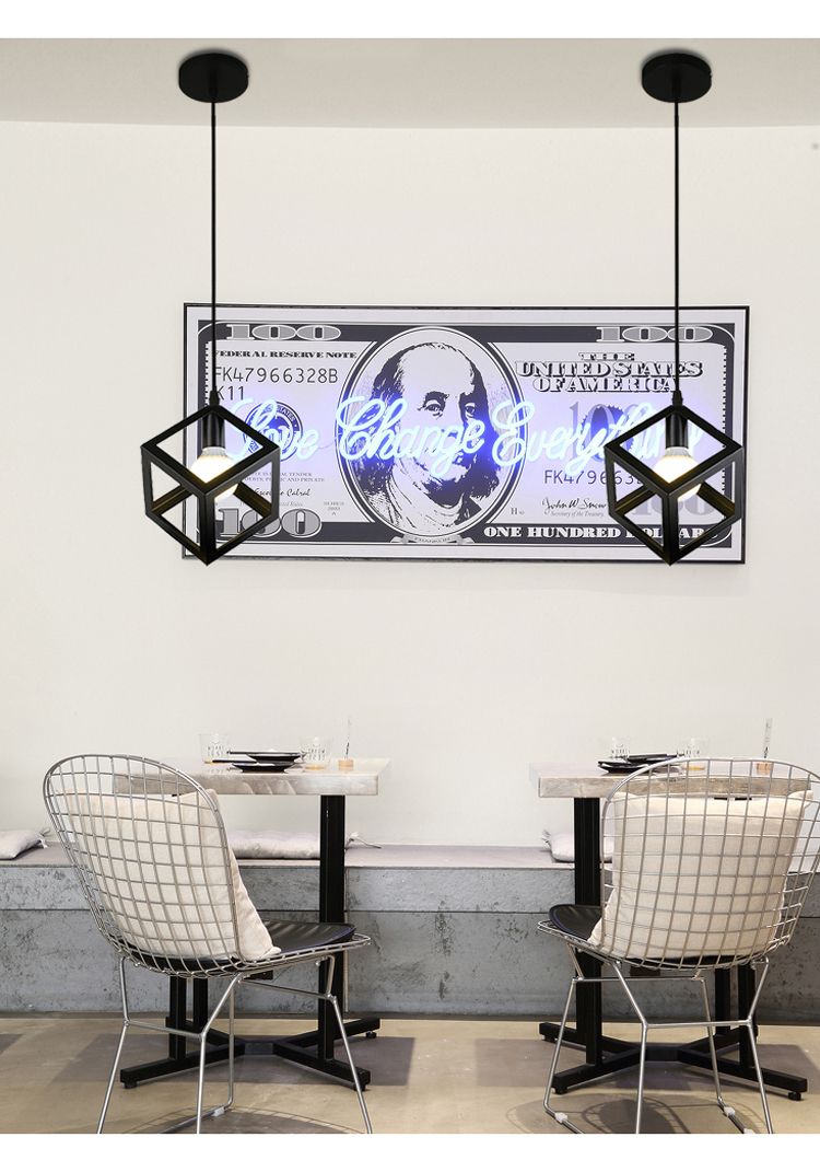 This pendant features a single square angle iron element, creating a visually captivating and contemporary aesthetic.