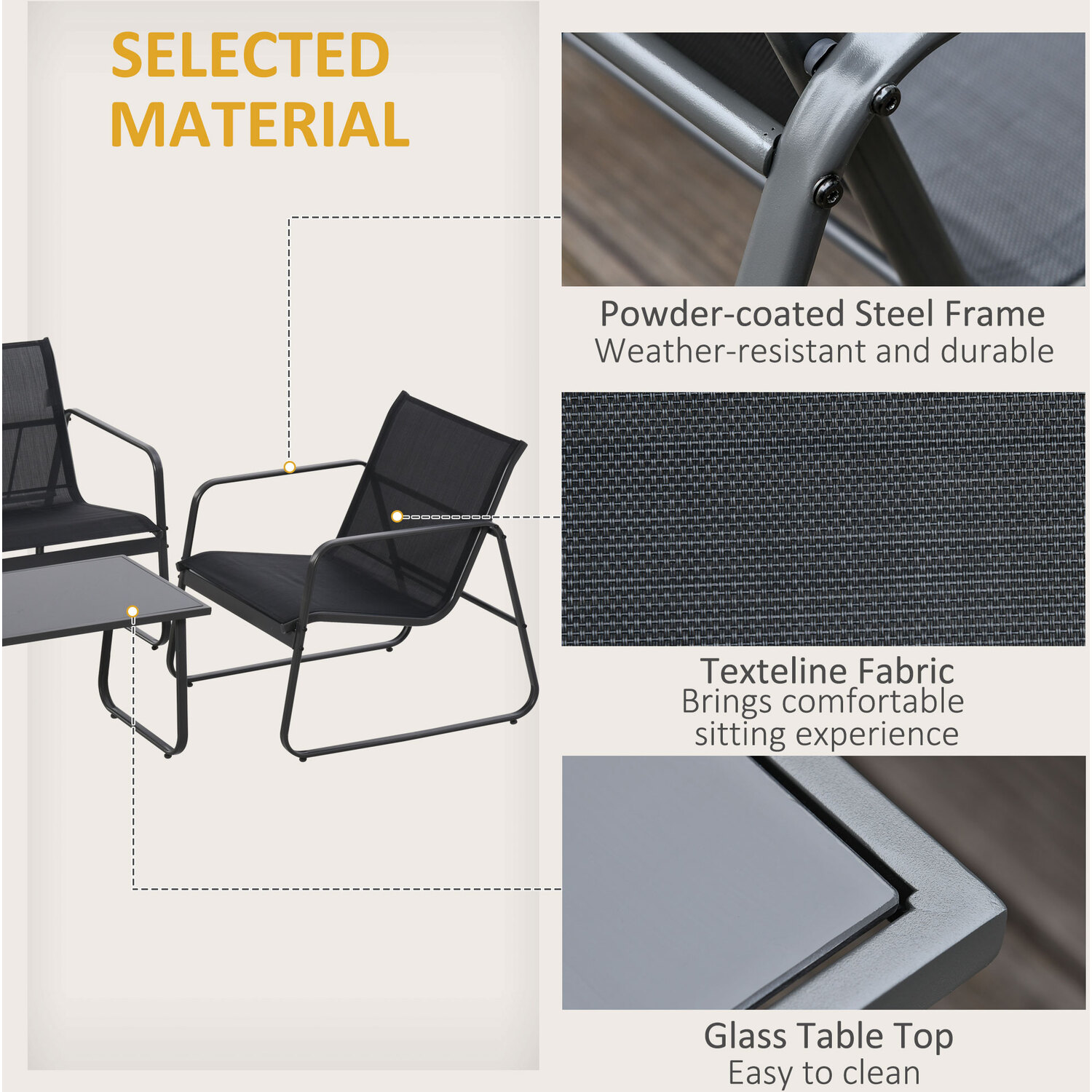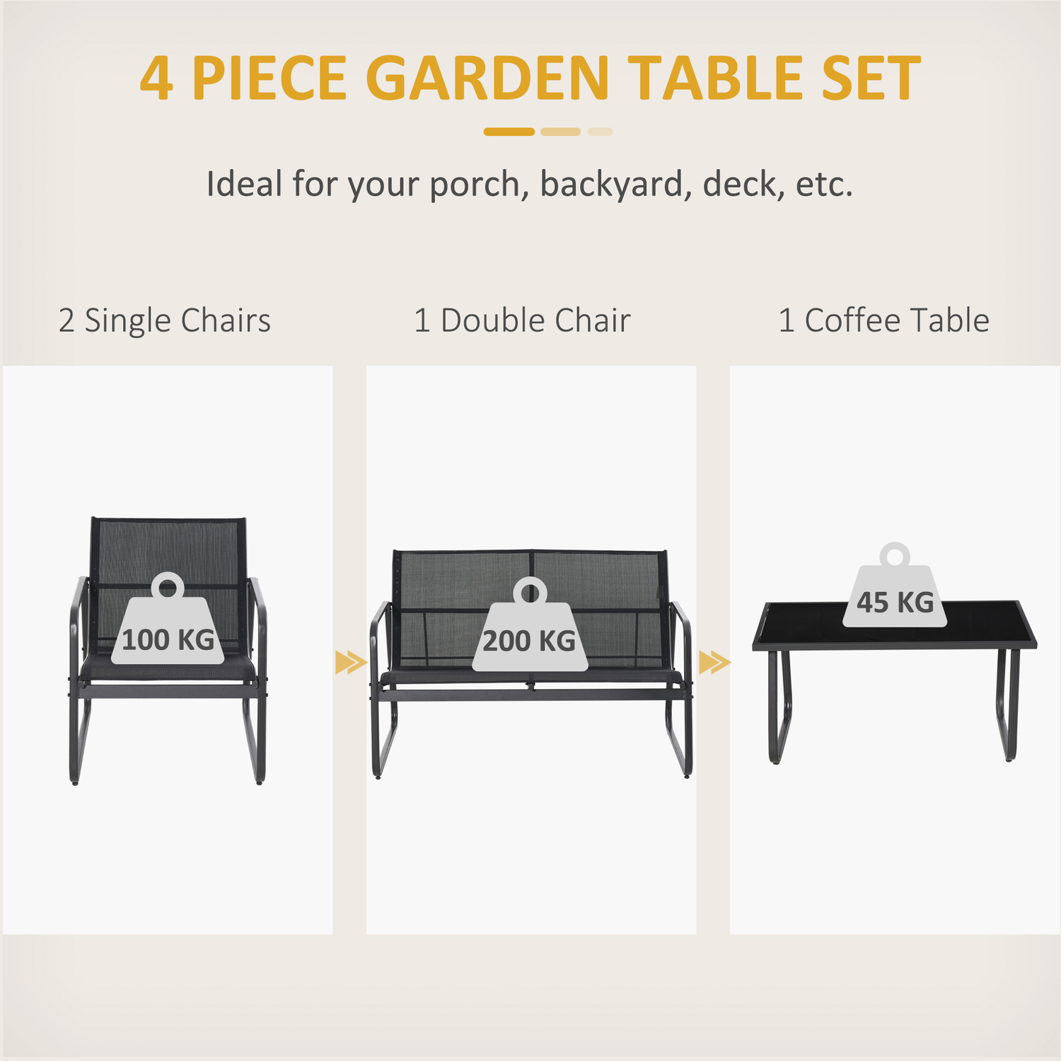 4-piece metal wrought iron outdoor sofa set is durable and designed for garden, terrace, or hotel use. Made of high-quality metal material, it offers long-lasting performance and a sleek aesthetic suited for outdoor furniture needs. With a seating capacity of 4 and available in dark grey, light grey, and black colour options, it combines functionality with versatility for various settings131.0