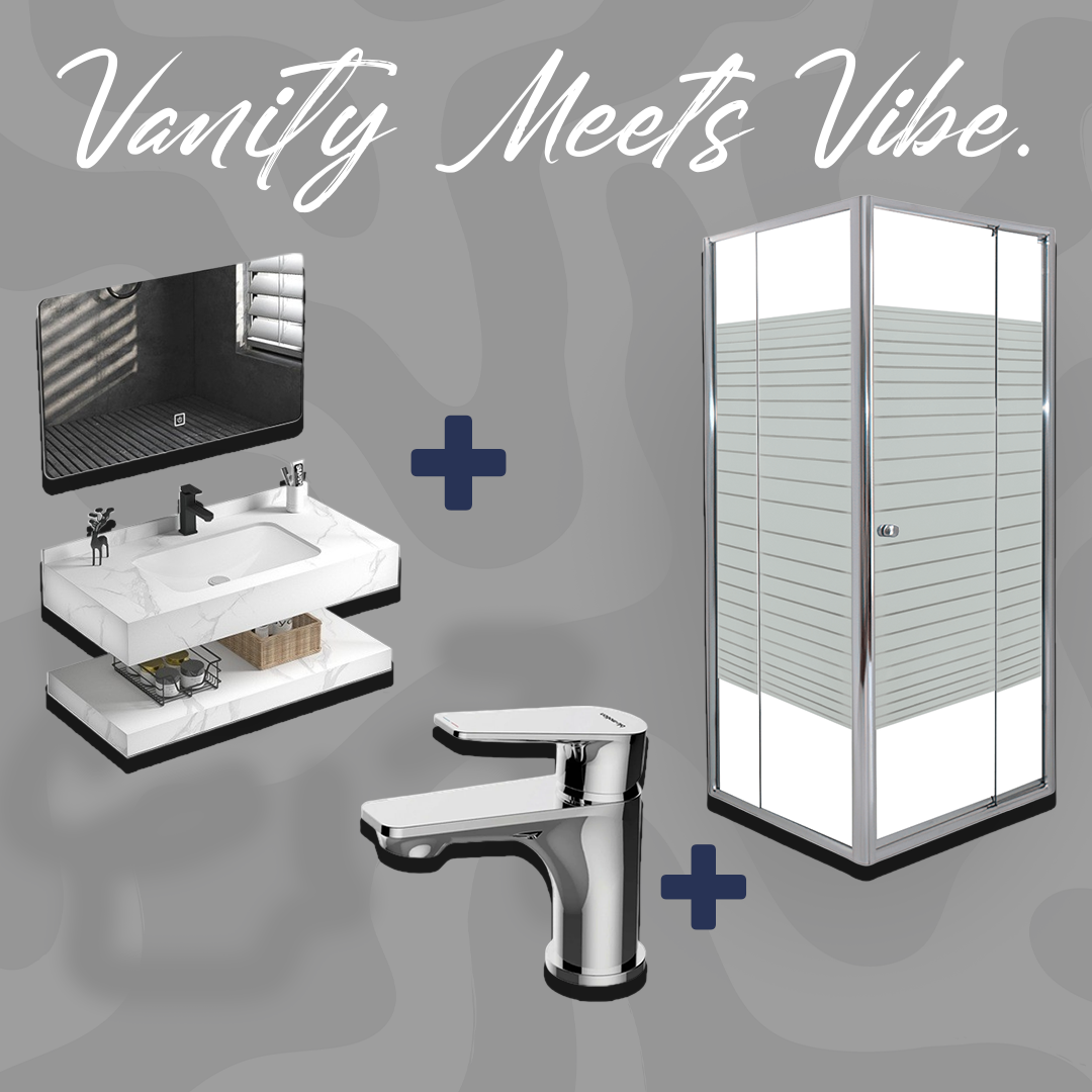 Step up your bathroom game with our sleek 3-piece Glacier Vanity set featuring a modern basin floating shelf and a Crystal clear mirror.